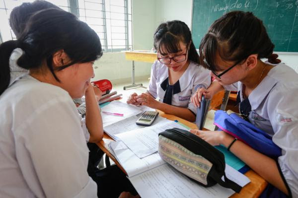 Giữa trưa, thí sinh Dương Kim Ngân cùng các bạn ôn bài trong phòng học mượn tạm tại trường tiểu học An Nghĩa, cách điểm thi 100 m. "Em đã ôn tập tương đối nên cùng các bạn thử giải các đề thi Toán từ những năm trước", Ngân nói.