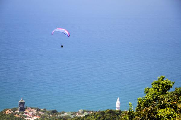 Một phi công điều khiển dù lượn bay phía trên chùa Linh Ứng.