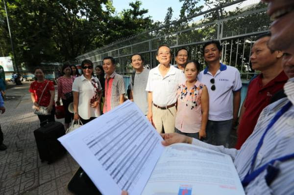 Kiểm danh sách CBGV Trường ĐH Kinh Tế TP.HCM trước giờ lên đường đi coi thi tại tỉnh Bình Phước sáng 20-6 - Ảnh: Như Hùng