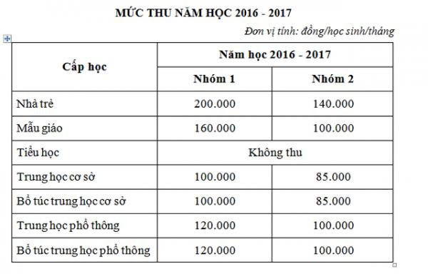 Nếu đề xuất của Sở được chấp nhận, mức học phí sẽ giữ nguyên như năm học 2016-2017. Mức học phí được chia thành hai nhóm đối tượng. Nhóm 1 là học sinh học tại trường ở các quận: 1, 2, 3, 4, 5, 6, 7, 8, 9, 10, 11, 12, Bình Thạnh, Phú Nhuận, Gò Vấp, Tân Bình, Tân Phú, Thủ Đức và Bình Tân.