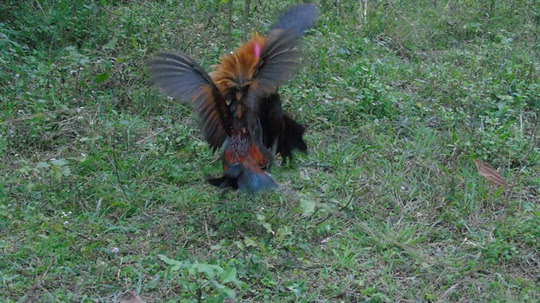 Gà rừng đáp xuống chuẩn bị giao chiến với gà mồi
