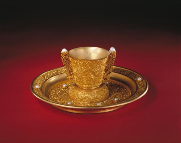 Chiếc cốc vàng được trang trí với ngọc trai và lời chúc mừng sinh nhật chỉ được dùng trong sinh nhật của vua và hoàng hậu dưới thời nhà Thanh. Các hiện vật được trưng bày không chỉ hé lộ cuộc sống bên trong hoàng cung mà còn cho thấy lịch sử, văn hóa của triều đại Minh, Thanh từ năm 1368. Ảnh: Nuvo.