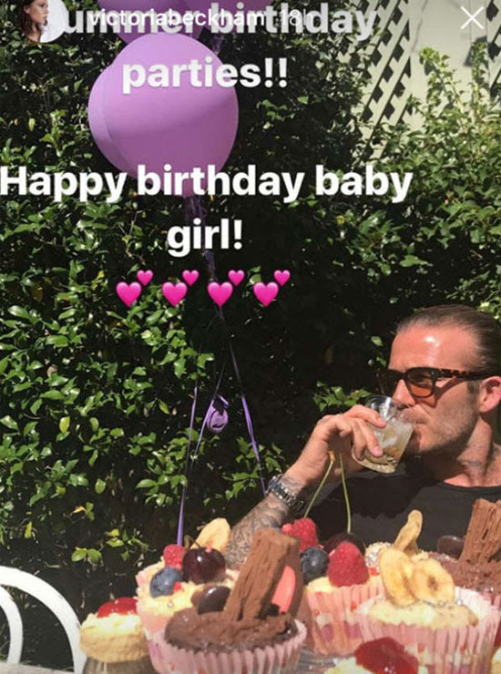 Nhà thiết kế thời trang sau đó đăng ảnh chồng thư thái thưởng thức đồ uống bên cạnh chiếc bàn đầy bánh. Tiệc sinh nhật của Harper được tổ chức ở trong vườn, giữa không gian ngập tràn ánh nắng. |