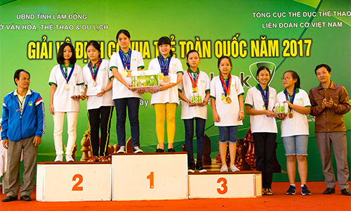 Giải thưởng bằng hiện vật cho các VĐV cờ chớp đồng đội nữ. Ảnh: Vietnamchess. |
