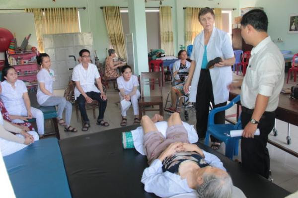Bà Virginia Mary Lockett (thứ hai từ phải) hướng dẫn các kỹ thuật viên giải pháp trị liệu cho một ca tai biến - Ảnh: TRƯỜNG TRUNG