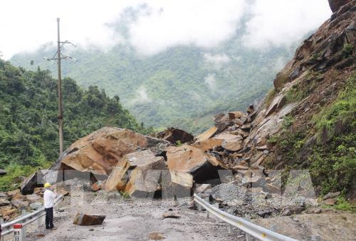 Hiện trường sạt lở đá tại Km33+450, Quốc lộ 279D (đoạn huyện Mường La). Ảnh: Nguyễn Cường - TTXVN