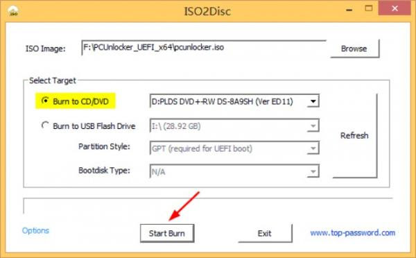 Sau khi ISO2Disc được cài đặt, khởi động ứng dụng và chọn tập tin ISO PCUnlocker làm nguồn và chọn CD hoặc USB làm điểm đến. Bây giờ, kích vào Start Burn.