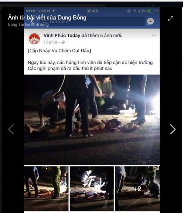 Gần đây tài khoản Facebook có tên “Dung Bống” đăng tải 1 loạt ảnh có liên quan đến vụ việc chém lìa đầu ở Vĩnh Phúc được rất nhiều người quan tâm.