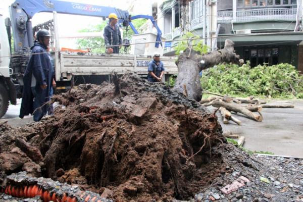 Do ảnh hưởng của cơn bão số 2, khu vực Nam Bộ có mưa và dông trên diện rộng. Tại TP.HCM, mưa kèm theo gió mạnh xuất hiện từ đầu giờ chiều khiến cây xanh bật gốc ở quận 1.