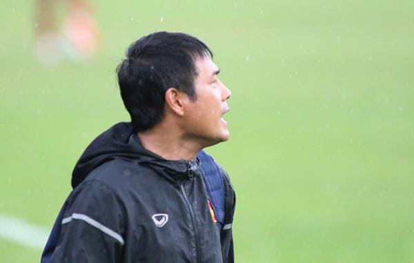 Cuối buổi tập chiều 19/8, trời bất ngờ đổ mưa lớn. HLV Hữu Thắng vội vã thúc giục các học trò dọn đồ, chạy lên xe.