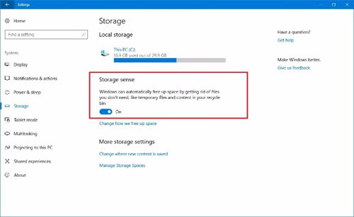 Windows 10 chứa tính năng mới mang tên Storage Sense, với mục đích tự động lưu trữ các tập tin và tập tin tạm trong thùng rác mà không cần phải làm bất cứ điều gì, giúp hệ thống tối ưu hóa không gian lưu trữ.