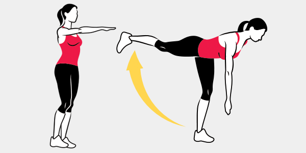 Chuẩn bị ở tư thế đứng thẳng, hai tay đưa phía trước ngực. Từ từ đồ người về phía trước, đưa thẳng một chân về phía sau, giữ thăng bằng trên một chân. Lặp lại động tác 20 lần rồi đổi bên. |
