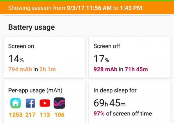 Con số này còn có thể cải thiện nữa nếu như bạn chọn chế độ Power Saving, trong đó các ứng dụng chạy ngầm và tốn nhiều pin như Facebook sẽ bị dừng một thời gian ngắn sau khi tắt màn hình. Lúc này máy chỉ tốn khoảng 0,23% cho mỗi giờ màn hình tắt. Như vậy thời gian sáng màn hình có thể lên tới 8 giờ, tương đương khoảng 2-3 ngày sử dụng thực tế.