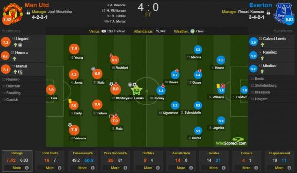Tiền vệ Marouane Fellaini (8 điểm): Tuyển thủ người Bỉ được HLV Jose Mourinho lựa chọn thay thế Paul Pogba trong đội hình chính của MU ở trận đấu này. Khác với lối chơi kiểm soát và điều phối bóng của tiền vệ người Pháp, Fellaini tích cực tham gia tranh cướp bóng và thường xuyên xuất hiện trong khu vực cấm địa, uy hiếp khung thành của Everton. Thống kê từ Whoscored, Fellaini thực hiện 4 pha tắc bóng, 5 tình huống không chiến thành công và tỷ lệ chuyền chính xác 80%