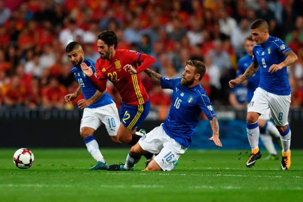 Đối mặt với 3 tiền vệ công di chuyển đầy linh hoạt kèm khả năng dứt điểm tốt, HLV Gian Piero Ventura trung thành với 4-2-4 sở trường, vốn rất dễ bộc lộ điểm yếu tốc độ lẫn khoảng trống tạo ra giữa nách hậu vệ biên và trung vệ/tiền vệ trụ. Hai tiền vệ Italy thực tế phải đấu với... 6 tiền vệ ưu tú bậc nhất Tây Ban Nha. 4-2-4 yêu cầu thể chất cực tốt ở khu trung tuyến, trong khi Italy ra sân với một người cao 1,65 mét (Verratti) lại chịu thẻ vàng từ sớm và một lão tướng 34 tuổi (Danielle De Rossi). Insigne và Candreva ở hai cánh đều hay dâng cao và không có xu hướng hỗ trợ phòng ngự tích cực. Thất bại là điều thấy rõ với Italy từ trước trận.