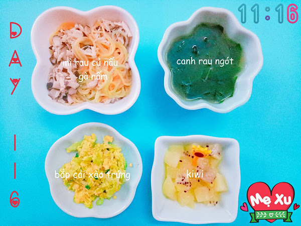 Mời các mẹ cùng tham khảo một số thực đơn hàng ngày qua các tháng tuổi mà chị Hằng đã chuẩn bị cho bé Xu: