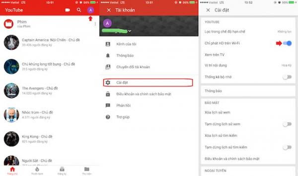 Trong ứng dụng YouTube, chúng ta bấm vào mục quản lý tài khoản ở góc trên bên phải màn hình. Trong màn hình tiếp theo, hãy chọn mục Cài đặt, sau đó bật tính năng Chỉ phát HD trên WiFi, đồng thời bật Chỉ tải lên qua WiFi.