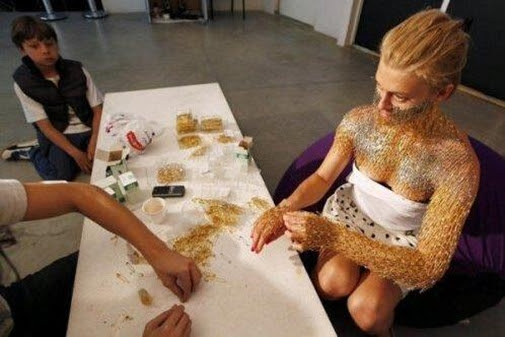 Dùng hàng nghìn chiếc kim băng đính lên người nhằm tạo nên một tác phẩm nghệ thuật độc đáo là ý tưởng “khác thường” của một cô gái trẻ người Úc.