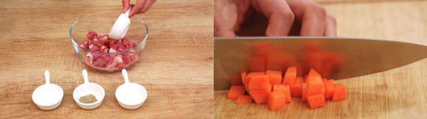 Thịt cắt miếng vuông nhỏ cho vào bát, thêm rượu, muối, hạt tiêu và bột ngô vào trộn đều. Ướp thịt khoảng 20 phút. Trong lúc ướp thịt bạn thái cà rốt thành miếng vuông nhỏ.