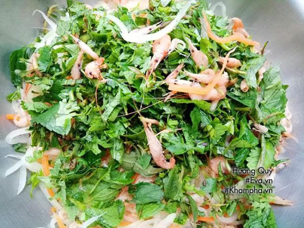 Bước 6: Tiếp đến cho phần rau thơm thái nhỏ vào trộn nhẹ nhàng, từ từ rưới phần nước mắm trộn nộm (Pha mắm trộn nộm: Nước cốt chanh tươi (2 thìa) : 2 thìa canh đường : 3 thìa canh nước: 1 thìa bột canh cùng tỏi, ớt băm nhỏ.