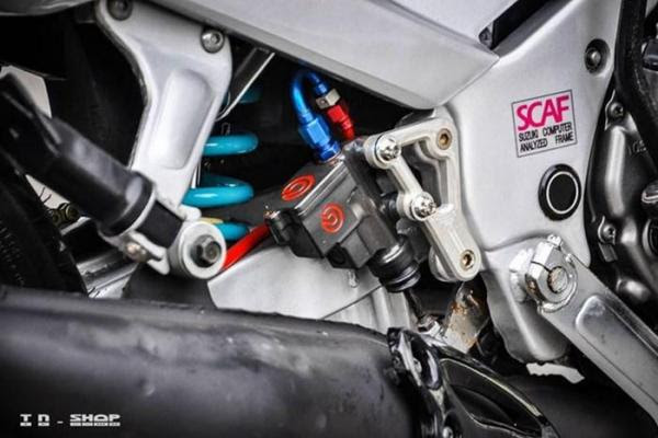Với những mẫu xe hai kỳ tốc độ đình đám, thông thường “dàn chân” sẽ được trau chuốt kỹ lưỡng nhất nhằm giảm trọng lượng, hạn chế độ “lì” của xe với mặt đường, nâng cao khả năng tăng tốc và đảm bảo an toàn. Vì vậy, chiếc “xì-po” này được trang bị rất nhiều đồ chơi “dàn chân” mà nổi trội là hệ thống phanh an toàn.