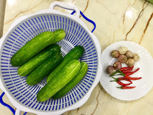 - Một kg dưa leo rửa sạch, bỏ ruột, cắt xéo, ngâm với 50gr muối hạt trong 2h.