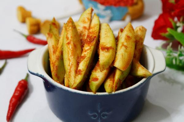 Xoài xanh rửa sạch, có thể để nguyên vỏ hoặc nạo sạch tùy theo ý thích. Thái xoài thành những thanh dài vừa ăn.