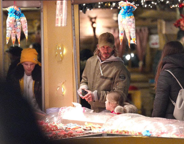 Becks tươi cười hớn hở ngồi cùng ghế với nhóc Cruz và cô út Harper trải nghiệm nhiều trò chơi trong công viên mùa đông