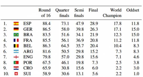 Cụ thể, một nhóm các nhà nghiên cứu Đức và Bỉ đã sử dụng trí tuệ nhân tạo để tìm ra nhà vô địch . Nhóm này đã tiến hành thực hiện các phép tính dựa trên nhiều chỉ số như bảng xếp hạng của FIFA, độ tuổi trung bình của một cầu thủ, số cầu thủ chơi cùng một câu lạc bộ, thậm chí các số liệu như dân số, tổng sản phẩm quốc nội GDP.