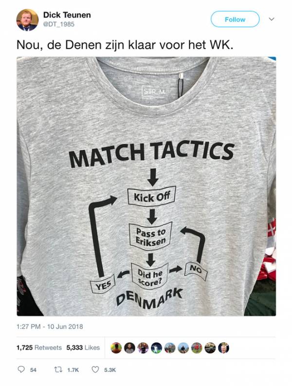 Chiến thuật của Đan Mạch được thể hiện trên áo phông như sau: Sau khi khai cuộc, hãy chuyền cho Eriksen để anh ta ghi bàn. Nếu anh ta bỏ lỡ cơ hội, hãy trả bóng lại để đợi cơ hội tiếp theo chuyền bóng cho Eriksen. Còn nếu anh ta ghi bàn? Tiếp tục đưa bóng vào cuộc để lặp lại chu trình nói trên.