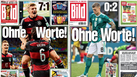 Tờ Bild của Đức giật lại tít cách đây 4 năm, sau khi Die Mannschaft hủy diệt Brazil 7-1: "Không nói nên lời". Tít giống nhau nhưng câu chuyện thì khác nhau.