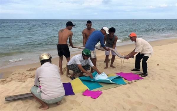 Cũng vào buổi sáng cùng ngày, tại xã Trung Trạch, huyện Bố Trạch, xác 1 con cá mái chèo có chiều dài hơn 4 mét và nặng khoảng 45 kg đã dạt vào bờ biển xã này và được ngư dân làm thủ tục mai táng theo nghi thức trang trọng...