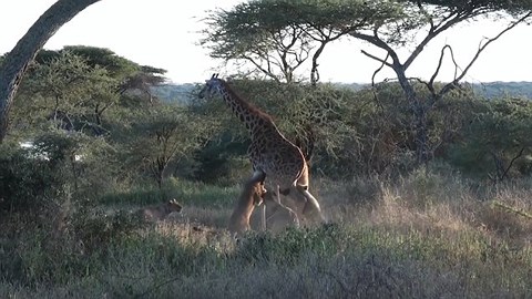 Gần đó, con hươu cao cổ đang mải kiếm ăn, trong tình trạng không cảnh giác. Bất ngờ, con sư tử đột ngột lao tới tấn công hươu cao cổ. Con vật cao lớn nhanh chóng tháo chạy nhưng trước vòng vây của kẻ săn mồi nguy hiểm nó hoàn toàn rơi vào thế bí.