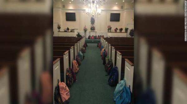 Hàng chục ba lô được đặt trong nhà thờ nơi diễn ra lễ tang cô giáo