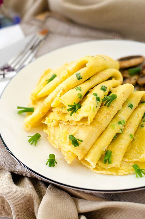 Cho 1 thìa cafe dầu ăn vào chảo phẳng, không dính. Đổ 1 lớp thật mỏng trứng vào, nghiêng chảo cho trứng dàn đều khắp mặt chảo. Chiên cho trứng chín mặt thì mới lật mặt còn lại. Sau khi trứng chín, gắp ra đĩa.