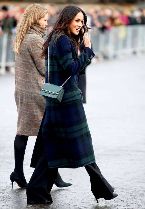 Diện mạo xinh đẹp của Meghan Markle khi cùng Hoàng tử Harry tại Edinburgh (Anh). Nữ công tước xứ Sussex thanh lịch, sang trọng với áo dạ dáng dài, họa tiết caro của nhà mốt Burberry. Cô kết hợp quần ống rộng Veronica Beard và túi đeo chéo mini màu xanh lá cây của Strathberry.