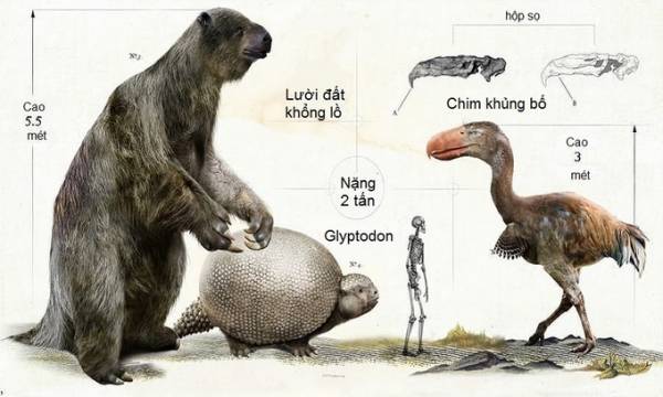 Lười đất khổng lồ kỷ Băng hà (Megatherium) cao 5,5 mét. Trong khi đó, Glyptodon, họ hàng thời tiền sử của con tatu ngày nay, to ngang một chiếc ôtô VW Beetle. Chim khủng bố, loài chim ăn thịt đến từ Đ