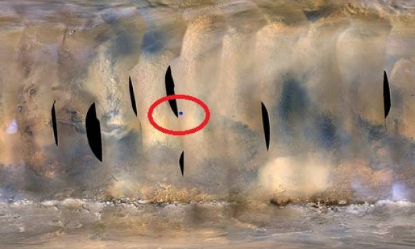 Chấm xanh trong vòng tròn là vị trí của robot Opportunity trong cơn bão bụi. Ảnh: NASA.