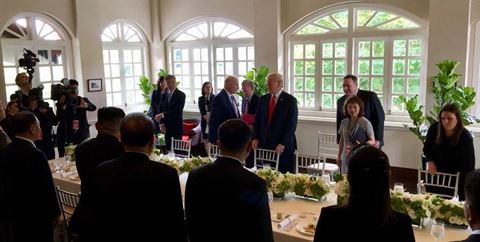 Tại tiệc làm việc trưa cùng ngày, phía phái đoàn Mỹ có Ngoại trưởng Mike Pompeo, Cố vấn An ninh quốc gia John Bolton, Chánh văn phòng Nhà Trắng John Kelly, Thư ký báo chí Nhà Trắng Sarah Sanders và người phiên dịch.