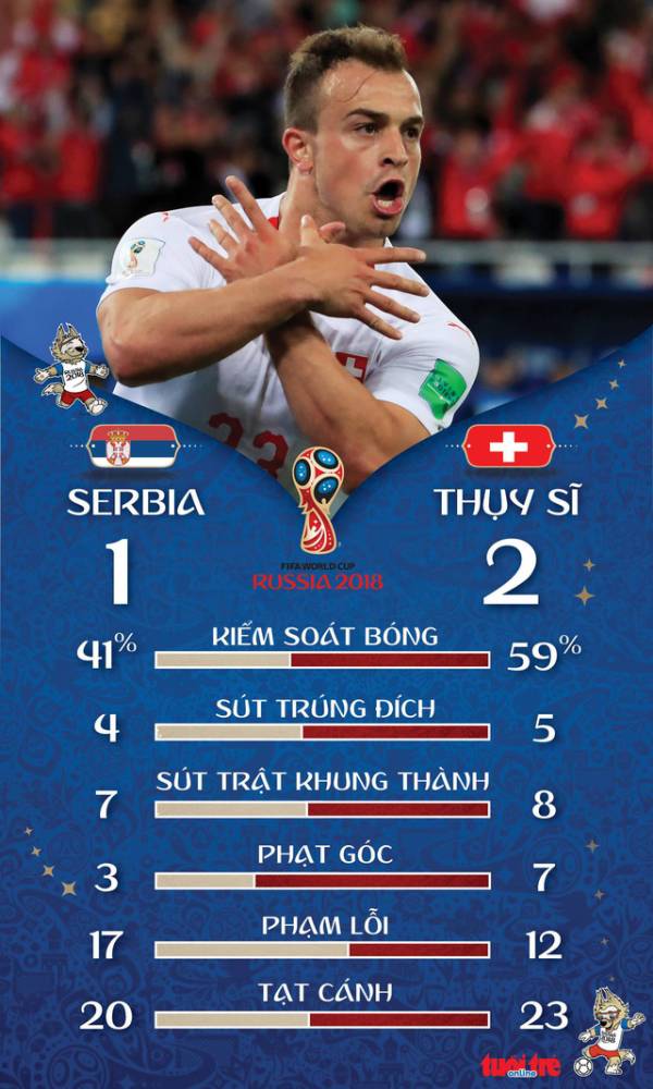 Trận đấu ở lượt trận thứ hai bảng E rạng sáng 23-6 đã kết thúc với chiến thắng 2-1 cho Thụy Sĩ trước Serbia. Thêm một lần nữa tại World Cup 2018 có một đội lội ngược dòng thành công.