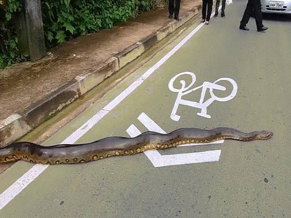 Con trăn dài 11 m được phát hiện ở thành phố Manaus, bang Amazonas, Brazil, Video quay lại cho thấy con trăn bò rất chậm khiến nhiều xe ô tô phải dừng lại.