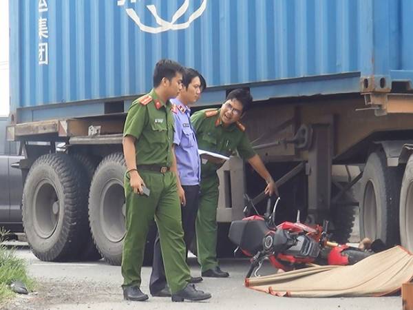 Nam thanh niên điều khiển xe máy va chạm với container và bị cán tử vong. Ảnh H. Tâm.