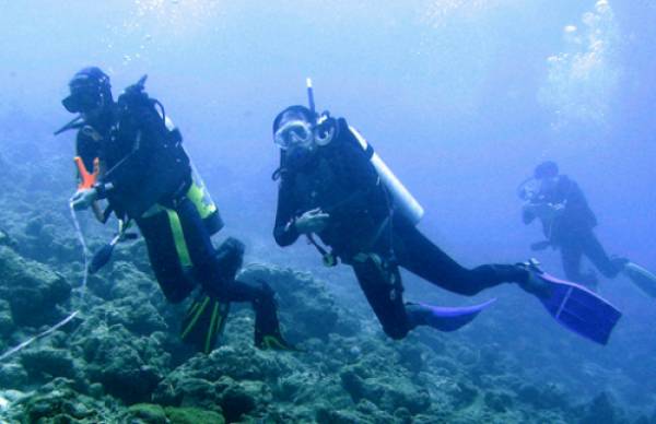 Các cán bộ Khu bảo tồn biển Cù Lao Chàm khoanh vùng khu vực biển Rạn Mè để làm vườn ươm san hô. Ảnh: Khu BTB Cù Lao Chàm.