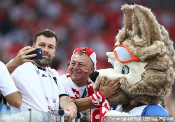 Cổ động viên Ba Lan đang selfie cùng linh vật của World Cup 2018, chú sói Zabivaka.
