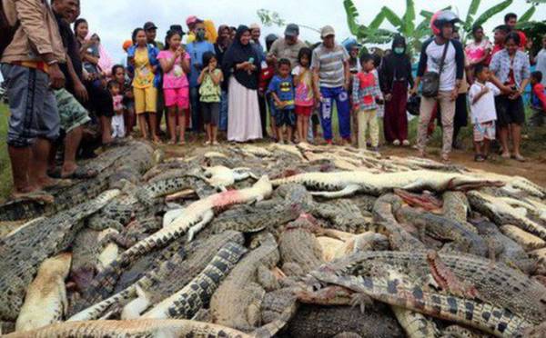 Trả thù cho người đàn ông bị cá sấu đoạt mạng trong trại nuôi cá sấu ở Indonesia, nhiều người dân trong làng đã tàn sát 292 con cá sấu bằng dao, búa và gậy gộc.