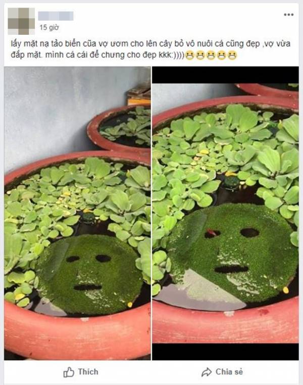 "Lấy mặt nạ tảo biển của vợ ươm cho lên cây bỏ vô nuôi cá cũng đẹp. Vợ vừa đắp mặt, mình có cái để chưng cho đẹp!"