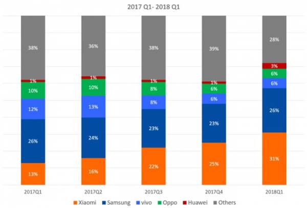 Trong quý 1/2018, Xiaomi dẫn đầu với 31% thị phần, theo sau là Samsung với 26% và các nhà sản xuất Trung Quốc khác như Vivo và Oppo (cùng đạt 6%) và Huawei (3%). Apple gần như mất hút và nằm trong nhóm các nhà sản xuất khác (chiếm 28%).