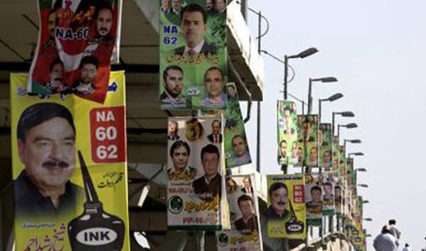 Biểu ngữ có hình các ứng viên trong cuộc tổng tuyển cử được treo trên các đường phố tại Pakistan. Ảnh: Diplomat
