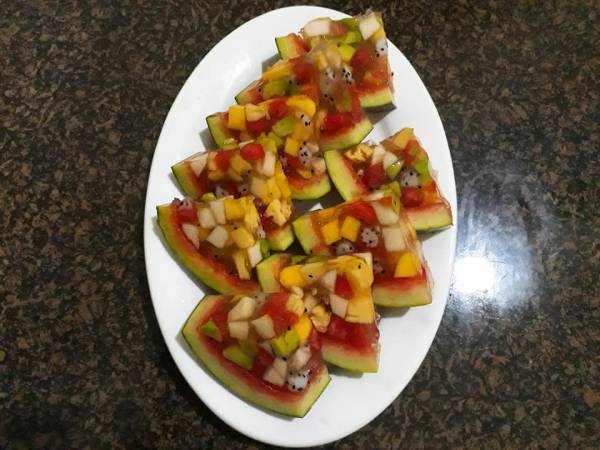 Đổ tất cả phần hoa quả đã thái hạt lựu vào nửa phần vỏ dưa hấu đã nạo. Sau đó đổ hỗn hợp nước rau câu lên. Dùng thìa hoặc đũa để đảo hoa quả đều cũng như phần nước rau câu chảy xuống bên dưới.