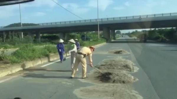 Ngay sau đó, chiến sỹ CSGT cùng một số công nhân vệ sinh môi trường đã cùng nhau dùng xẻng và các vật dụng cần thiết dọn số đất cát trên. Sau khoảng 30 phút đoạn đường này đã được dọn sạch sẽ, thông thoáng.